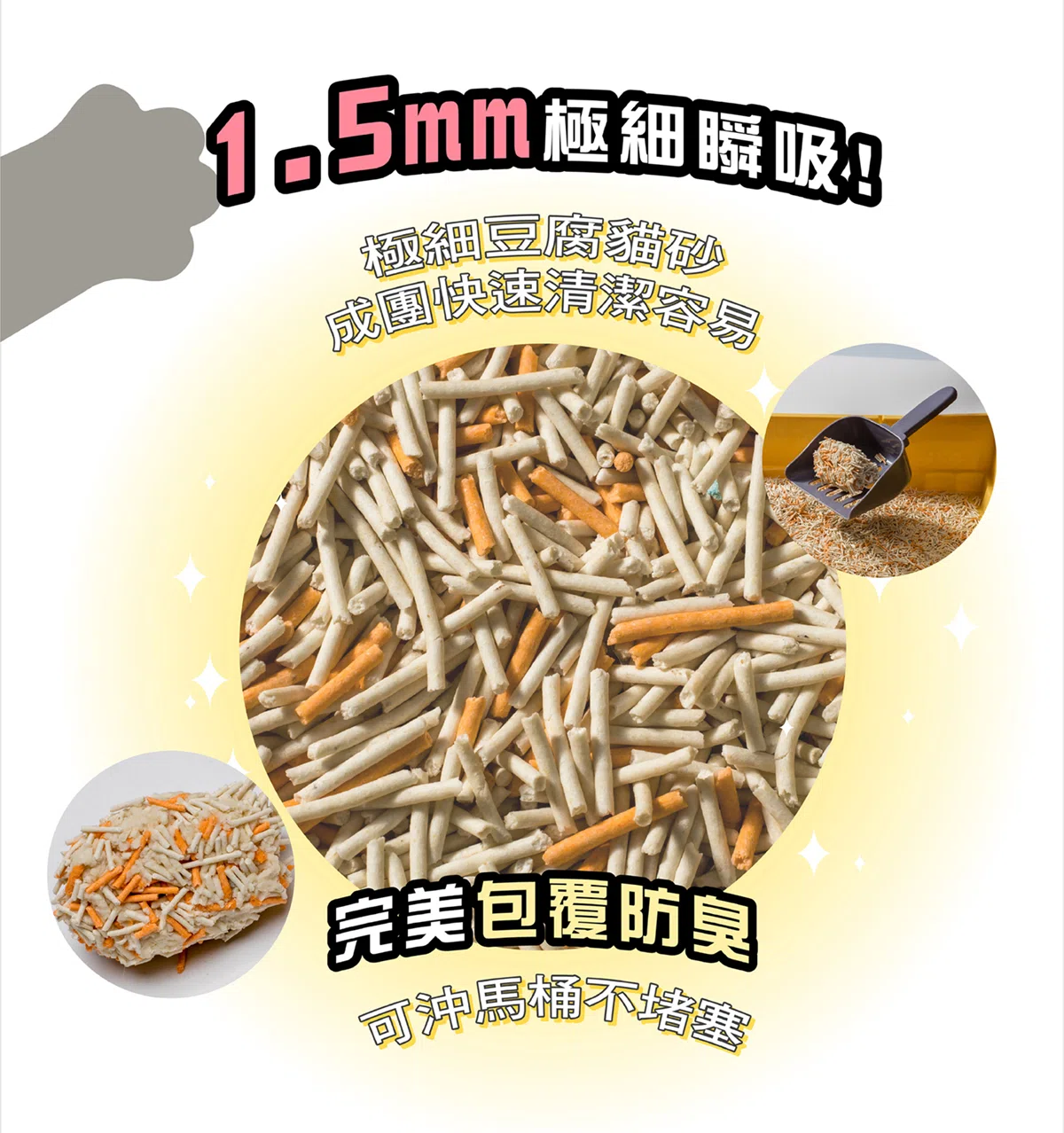 ✔ 超強吸水:超強吸水,迅速結塊不崩散